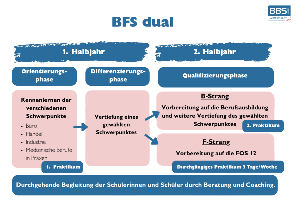 Die BFS dual dauert ein Schuljahr und besteht aus zwei Strängen: